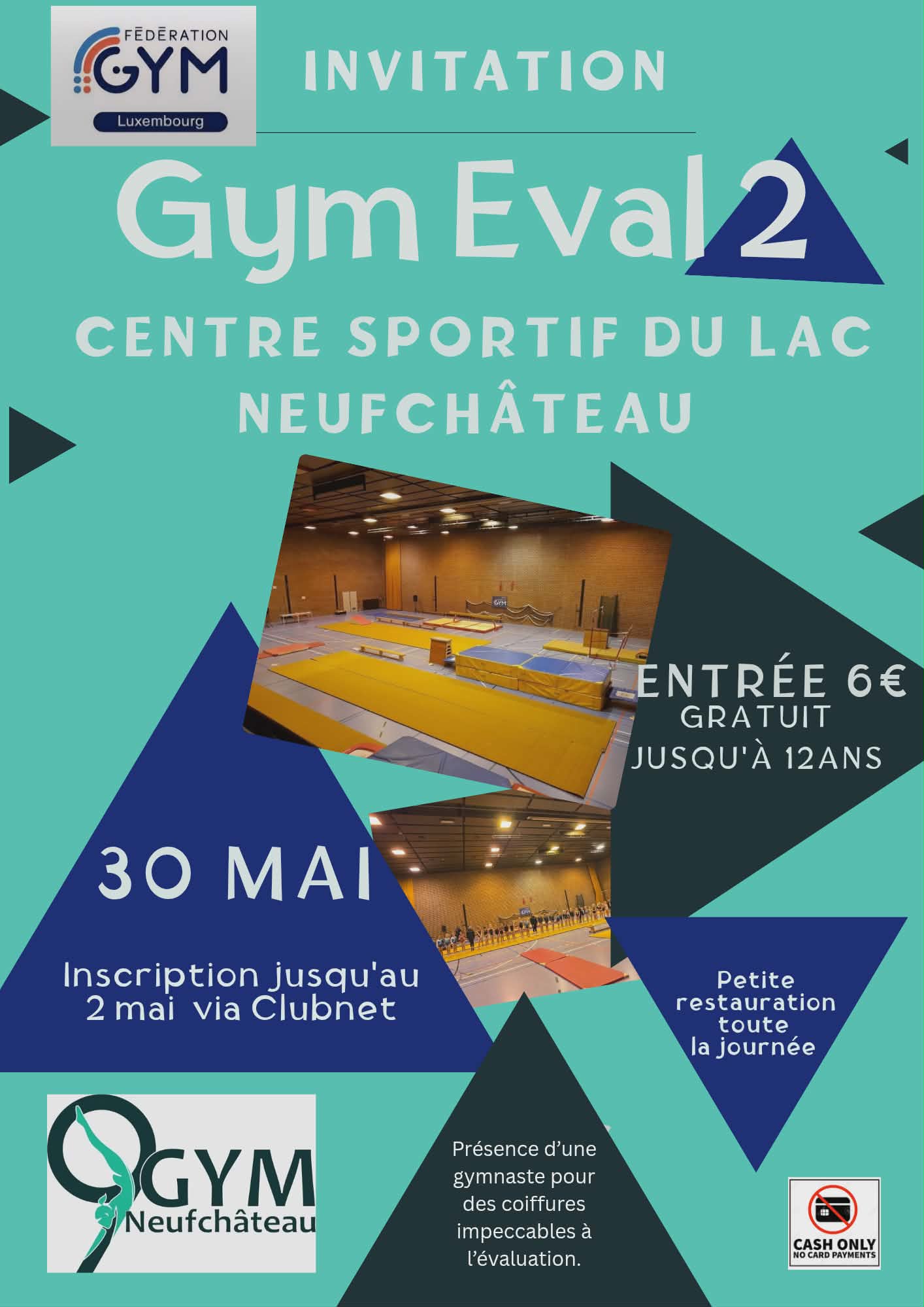 9Gym Neufchâteau a le plaisir de vous inviter à son Gym Éval, qui se déroulera au Centre du Lac à Neufchâteau le 30 mai 2026, durant toute la journée. Venez nombreux encourager nos gymnastes et partager ce beau moment avec nous ! Pour plus d'informations, c'est ici : voir l'affiche